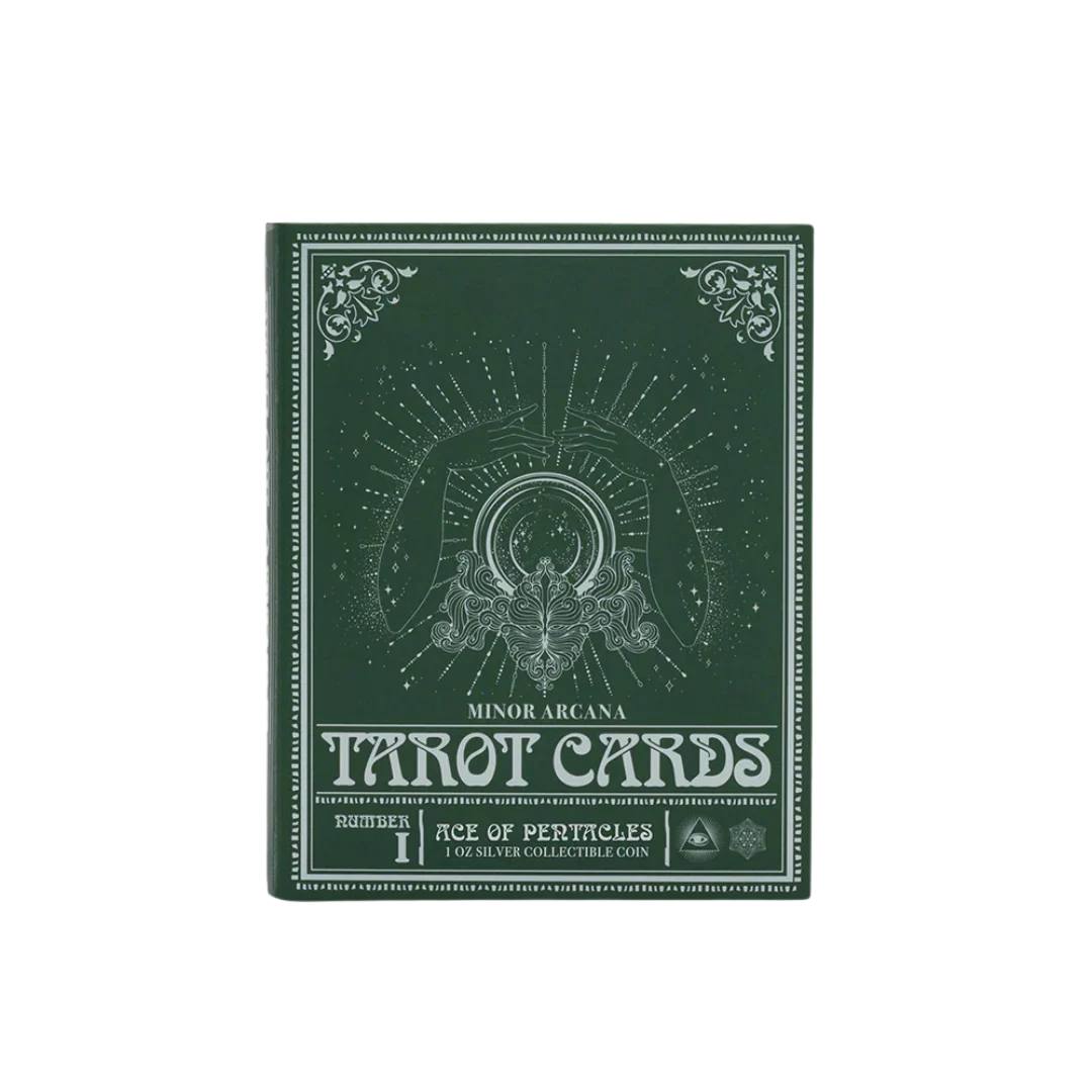 The third card is drawn. The Ace of Pentacles joins our 1oz 999 pure silver Tarot Minor Arcana series with a design rooted in prosperity, grounding, and new beginnings. The artwork is framed with a mirror-finish border, and a shimmering green triangle sits in the top left corner, representing Earth, the alchemical symbol of the Pentacles Suit.