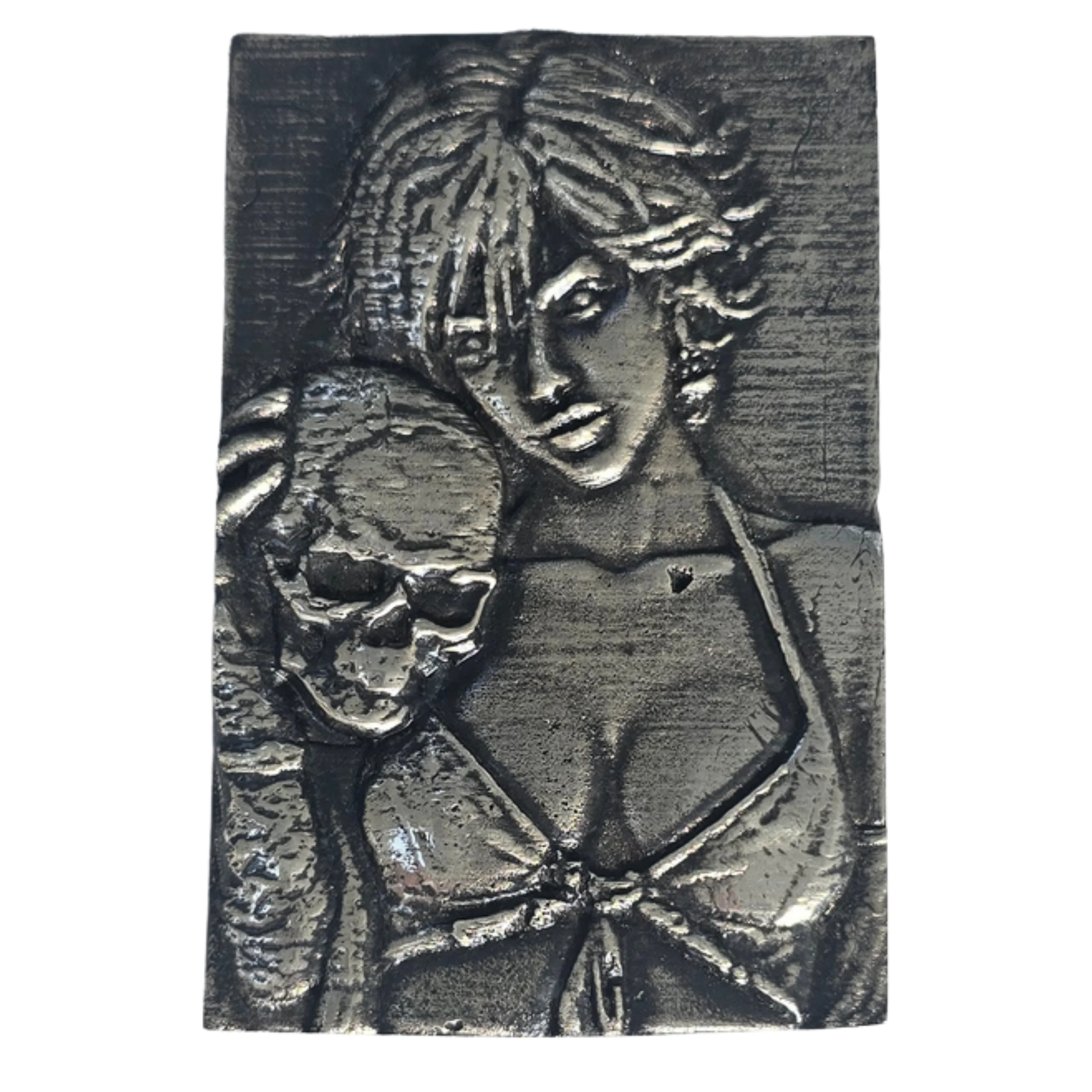 This exquisite single panel miniature artwork set crafted from 999 pure silver captures three beautiful smouldering women all holding skulls. This set has three individually crafted panels in their own 3D printed matching boxes. They are incredibly detailed and strikingly beautiful.